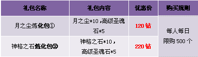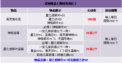 【活动内容】活动期间,商城限时热卖神格宝箱、星之泪碎片宝箱,可开出稀有炼化合成材料“神格碎片”、“星之泪碎片”。炼化你的光暗英灵,成就神级传说!