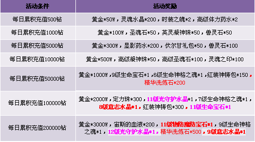 1. 每日累积充值达到1000钻石可同时获得累积充值1000和500档次的两重奖励,依此类推;