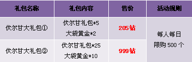 【活动内容】活动期间,伏尔甘礼包搭配大袋黄金特价出售,小伙伴们再也不用为神铸黄金不够发愁啦,赶快行动吧!
