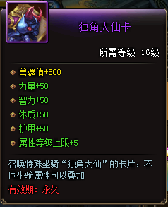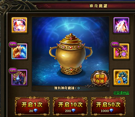 【活动内容】魔罐神秘降临,变幻无常的珍稀翅膀无常之翼,空灵傲然于天空之城。坐骑独角大仙卡(全属性+50),炫酷坐骑,物种稀缺,魔罐首次登场。神光笼罩的天空之城焕然一新,英灵的道路更深远,舞台更广阔,同时被赋予更强大的力量,英灵装备应运而生。魔罐特别推出红装神铸包,红装材料包,9级生命宝石,英灵装备强化包,子女相关道具,高级凝神珠,高级圣魂石,神圣能量各种珍稀道具,只要你开,即可拥有!