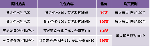 1. 礼包仅在商城“限时热卖”处出售,道具仅限“钻石”购买;