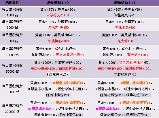 3. 活动期间累计消费满足条件可领取奖励,每重奖励玩家只能领取一次, 请留意领取活动奖励。