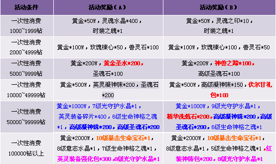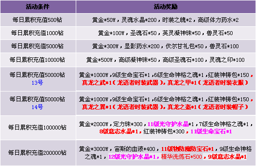 【活动内容】活动期间,累积充值指定金额,即可获得超值大礼。双属性宝石,各种珍贵道具等你来拿!
