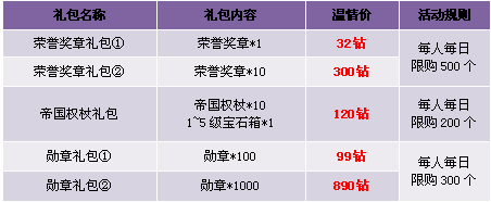 【活动内容】活动期间,商城上架特价荣誉奖章礼包、帝国权杖礼包。冲刺荣誉巅峰,做人生赢家。