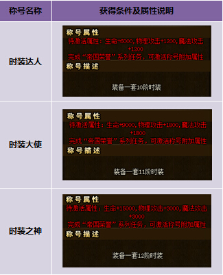 合成一套10、11、12阶时装装备后还能额外获得以下特殊称号: