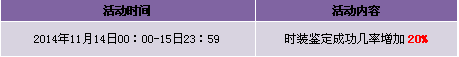【活动内容】活动期间,商城上架时装之魄,时装鉴定成功几率增加20%,且以绑钻形式返还30%的鉴定费用。提战力好时机,时装鉴定轻松享受。