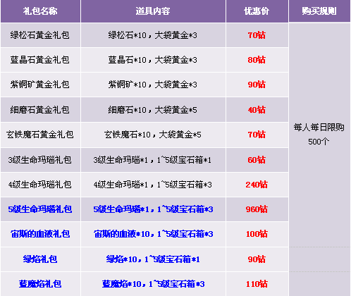 1. 优惠礼包在商城“限时热卖区”出售,限时热卖区域中的道具仅限“钻石”购买;