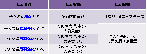 2. 子女装备累积强化,每档每日可完成一次,活动每天凌晨0点重置;