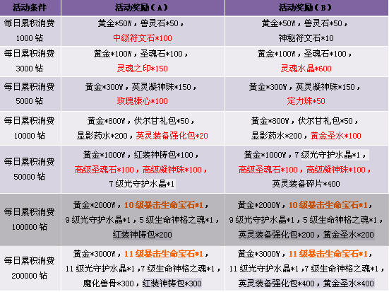 3. 活动期间累计消费满足条件可领取奖励,每重奖励玩家只能领取一次, 请留意领取活动奖励。