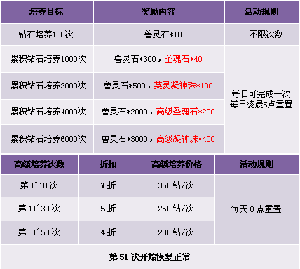 2. 坐骑钻石培养打折每天0点重置,使用钻石进行高级培养打折,使用绑定钻石、兽灵石高级培养不打折,不消耗打折次数,不计算在累积培养活动内;