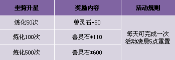 【活动内容】活动期间,坐骑升星超值大返还,炼化更送兽灵石好礼,赶快把你的神兽培养起来吧!