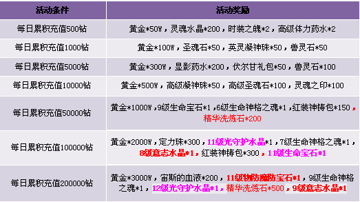 1. 每日累积充值达到1000钻石可同时获得累积充值1000和500档次的两重奖励,依此类推;