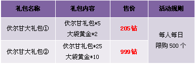 【活动内容】活动期间,伏尔甘礼包搭配大袋黄金特价出售,小伙伴们再也不用为神铸黄金不够发愁啦,赶快行动吧!