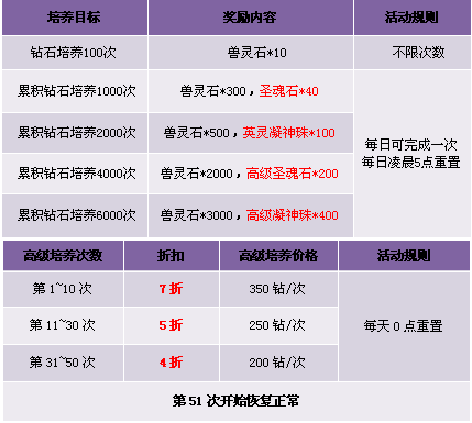 2. 坐骑钻石培养打折每天0点重置,使用钻石进行高级培养打折,使用绑定钻石、兽灵石高级培养不打折,不消耗打折次数,不计算在累积培养活动内;