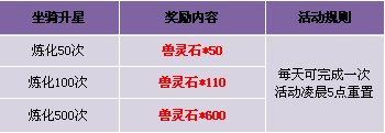 【活动内容】活动期间,坐骑升星超值大返还,炼化更送兽灵石好礼,赶快把你的神兽培养起来吧!