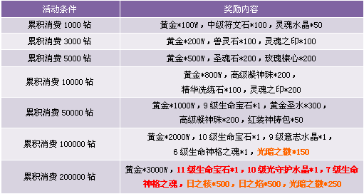 3. 活动期间累计消费满足条件可领取奖励,每重奖励玩家只能领取一次, 请留意领取活动奖励。