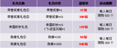 【活动内容】活动期间,商城上架特价荣誉奖章礼包、帝国权杖礼包。冲刺荣誉巅峰,做人生赢家。