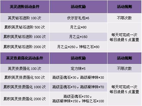 1. 英灵资质强化100次,、英灵钻石进阶活动,可重复参加获得奖励;