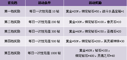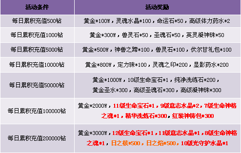 1. 每日首次充值10钻以上即可获得第一档奖励,领完本档奖励可充值参加下一档活动,第二次一次性充值200钻以上可以获得第二档奖励,以此类推,一次充值达到条件领取对应档礼包一份;