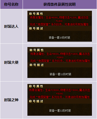 合成一套10、11、12阶时装装备后还能额外获得以下特殊称号:
