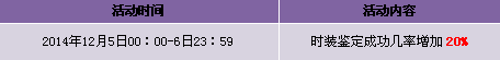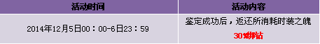 【活动内容】活动期间,商城上架时装之魄以及打折时装,时装鉴定成功几率增加20%,且以绑钻形式返还30%的鉴定费用。提战力好时机,时装鉴定轻松享受。