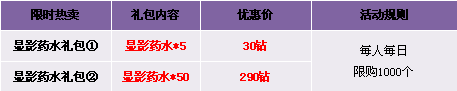 【活动内容】活动期间,商城热卖折扣出售显影药水礼包。还在为高级公会技能发愁吗?赶快抢购吧!