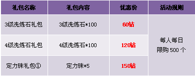 【活动内容】活动期间,商城上架洗练石礼包。低价享受洗练石,轻松提升装备属性。