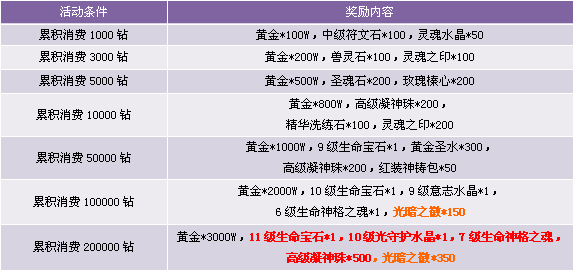 3. 活动期间累计消费满足条件可领取奖励,每重奖励玩家只能领取一次, 请留意领取活动奖励。