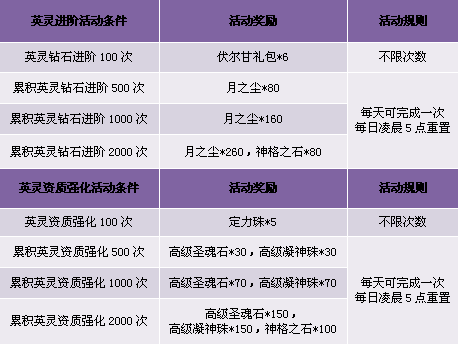 1. 英灵资质强化100次,、英灵钻石进阶活动,可重复参加获得奖励;