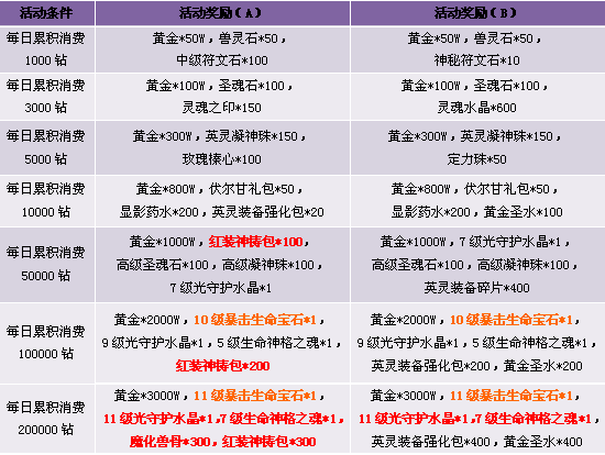 3. 活动期间累计消费满足条件可领取奖励,每重奖励玩家只能领取一次, 请留意领取活动奖励。