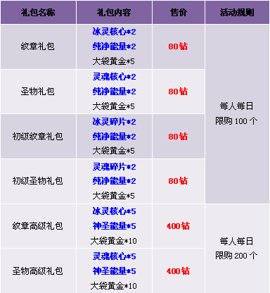 【活动内容】活动期间,纹章圣物材料礼包搭配大袋黄金特价出售,从此紫色品质纹章圣物触手可及!