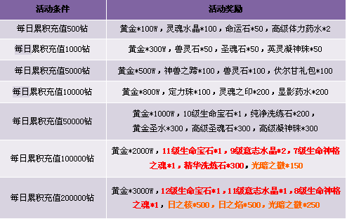 1. 每日累积充值达到1000钻石可同时获得累积充值1000和500档次的两重奖励,依此类推;