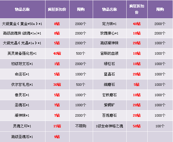 1. 礼包仅在商城“限时热卖”处出售,道具仅限“钻石”购买;