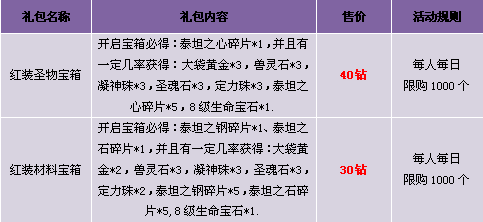 【活动内容】活动期间,红装圣物宝箱和红装材料宝箱齐齐上架游戏商城,机会不容错过。