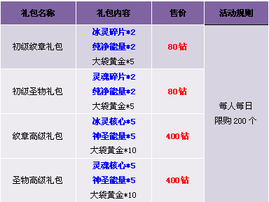 【活动内容】活动期间,纹章圣物材料礼包搭配大袋黄金特价出售,从此紫色品质纹章圣物触手可及!