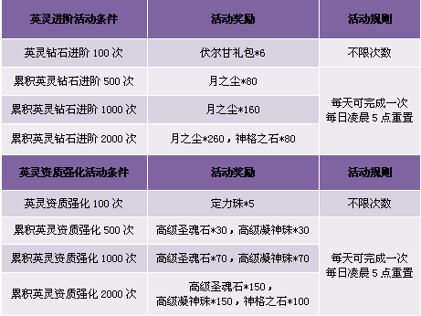 1. 英灵资质强化100次,、英灵钻石进阶活动,可重复参加获得奖励;