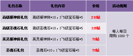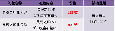 【活动内容】活动期间,商城热卖灵魂之印礼包。灵魂之印、宝石箱,限时限量打包出售。