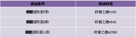 【活动内容】活动期间,玩家时装升阶到7阶及以上,可获得奖励时装之魄。升阶翅膀提升战力,成就一代战将之王!