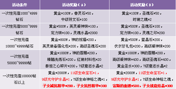 【活动内容】活动期间,一次性充值指定金额,即可获得超值大礼。高级凝神珠、高级圣魂石、高级宝石、守护水晶,各种珍贵子女道具,充值拿钻石得奖励。