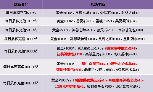 【活动内容】每日累积充值领取各种道具,还有高级双属性宝石、守护水晶和意志水晶!