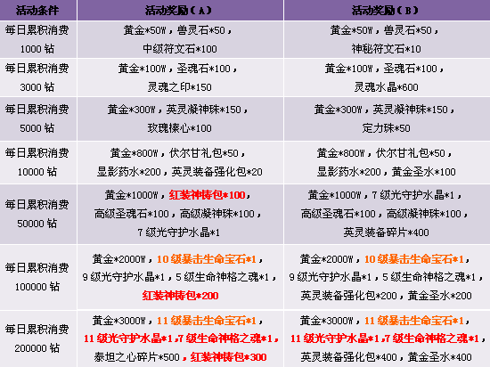 3. 活动期间累计消费满足条件可领取奖励,每重奖励玩家只能领取一次, 请留意领取活动奖励。