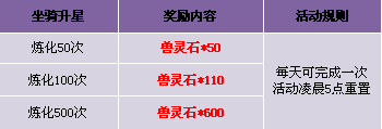 【活动内容】活动期间,坐骑升星超值大返还,炼化更送兽灵石好礼,赶快把你的神兽培养起来吧!