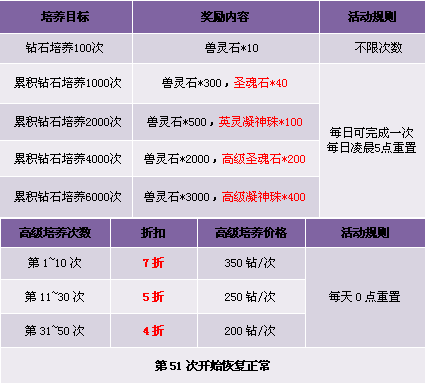 2. 坐骑钻石培养打折每天0点重置,使用钻石进行高级培养打折,使用绑定钻石、兽灵石高级培养不打折,不消耗打折次数,不计算在累积培养活动内;