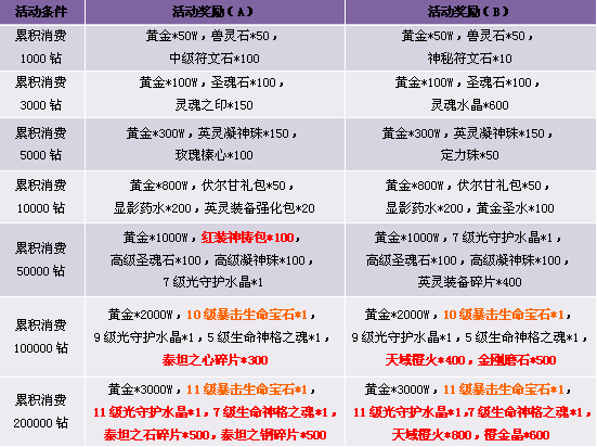3. 活动期间累计消费满足条件可领取奖励,每重奖励玩家只能领取一次, 请留意领取活动奖励。