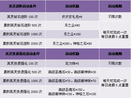 3. 英灵进阶活动仅限使用钻石培养,绑定钻石与圣魂石均不计算在内;