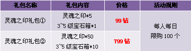 【活动内容】活动期间,商城热卖灵魂之印礼包。灵魂之印、宝石箱,限时限量打包出售。