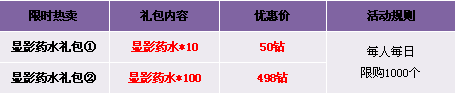 【活动内容】活动期间,商城热卖折扣出售显影药水礼包。还在为高级公会技能发愁吗?赶快抢购吧!