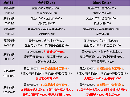 3. 活动期间累计消费满足条件可领取奖励,每重奖励玩家只能领取一次, 请留意领取活动奖励。