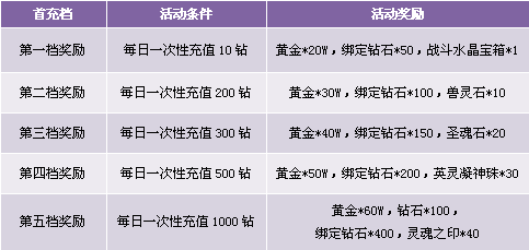 1. 每日首次充值10钻以上即可获得第一档奖励,领完本档奖励可充值参加下一档活动,第二次一次性充值200钻以上可以获得第二档奖励,以此类推,一次充值达到条件领取对应档礼包一份;