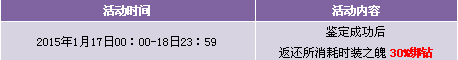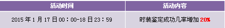【活动内容】活动期间,商城上架时装之魄以及打折时装,时装鉴定成功几率增加20%,且以绑钻形式返还30%的鉴定费用。提战力好时机,时装鉴定轻松享受。
